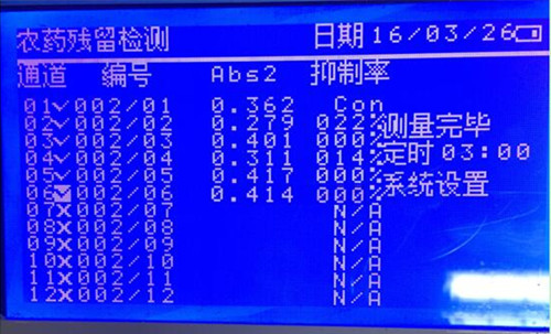 檢測(cè)結(jié)果如圖所示,結(jié)果以酶被抑制的程度,即抑制率表示。當(dāng)果蔬樣品提取液對(duì)酶的抑制率為40~50%時(shí),則表明被測(cè)樣品為可疑農(nóng)殘超標(biāo)樣品;當(dāng)抑制率≥50%時(shí),表示蔬菜中有高劑量有機(jī)磷或氨基甲酸酯類農(nóng)藥存在,樣品為陽(yáng)性結(jié)果。所以樣品中農(nóng)藥殘留符合國(guó)家標(biāo)準(zhǔn)。