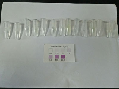 北京智云達技術工程師楊老師和王老師首先對不同樣品通過使用北京智云達自主研發生產的快速檢測產品:甲醛速測管,對泡椒鳳爪樣品進行甲醛含量的檢測。