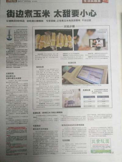 檢測結(jié)果:八個玉米樣品均含有糖精鈉,而國家標(biāo)準(zhǔn)中甜玉米是不得檢出糖精鈉,說明在外面購買甜玉米時很容易就會購買到含有糖精鈉的甜玉米,北京智云達(dá)提醒廣大消費者盡量少購買路邊攤甜玉米,最好選擇購買生玉米在家煮制,以保證食品的安全。