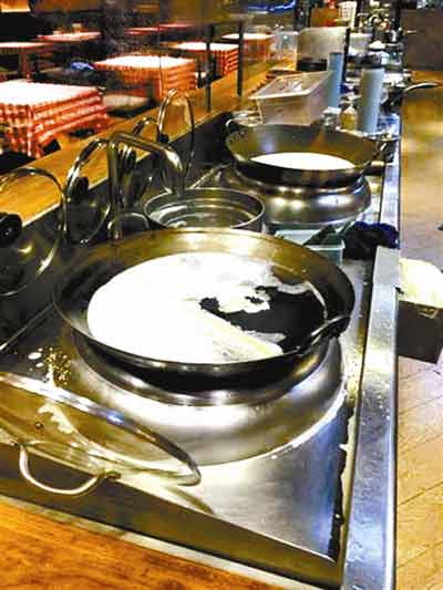 “廚房是開放式的,透過玻璃窗看見他們就那樣在鍋里涮抹布。”提到28日晚自己看到的情形,于女士仍有些生氣。于女士告訴北青報記者,28日晚8點50分左右,曾在王府井大街北京APM購物中心的“西貝莜面村”店內就餐,“當時店里的員工說他們是晚上9點‘閉餐’,不能加菜了,然后店里有不少服務員正在打掃衛生。”于女士回憶,因為店內的廚房是透明玻璃窗、朝著店內的,“吃飯時就看到廚房里有一個廚師把擦玻璃的抹布放在平時炒菜的鍋里涮。”于女士出示了當時自己拍下的幾張圖片,其中一張圖片中顯示,兩口炒菜鍋內盛放著帶有泡沫的液體,其中一口鍋內還泡著沾有油漬的抹布。