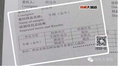 然而,湖南經(jīng)視新聞?wù){(diào)查報道,這家湖南知名的餐廳送檢的一份兒童牛排(檢測單位:湖南出入境檢驗檢疫局),除了牛源性成分,還檢測出有鴨成分。
