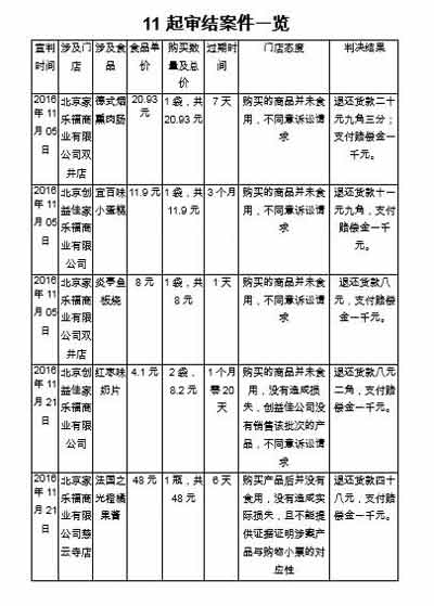 上個月,朝陽法院審結(jié)的11起案件,涉及北京家樂福4家店,即雙井店(2起)、創(chuàng)益佳店(2起)、慈云寺店(1起)和四元橋店(6起)。