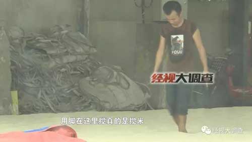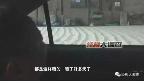 除了受潮、甚至被水浸泡過之外,這些晾曬的大米很有可能已經變質發霉。經過連續幾天的蹲點觀察,調查人員發現了這樣一個細節:有些袋子感覺都已經發霉了。