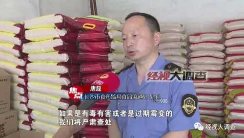 執法人員發現,在這些過期問題大米周邊都存在著一種粉末狀的藥物。趕來的老板這樣解釋:“就是對這些米質量要求不那么嚴格的了,我會對他說這個米是怎么樣的,這些米的質量肯定不如正常的。”