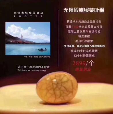 “精選桐木關(guān)絕品金駿眉泡制,海拔1140米農(nóng)家散養(yǎng)土雞蛋,江湖上傳說(shuō)的牛欄坑肉桂,精選果碳、潮州紅泥炭爐,冬蟲(chóng)夏草、鐵皮石斛等八味秘制配料,經(jīng)過(guò)24小時(shí)文火慢煨,12小時(shí)靜置而成的——無(wú)錫殿堂級(jí)茶葉蛋,2899元每顆且限量供應(yīng)。近日,無(wú)錫太悅度假酒店公開(kāi)銷售的茶葉蛋成為了網(wǎng)紅。