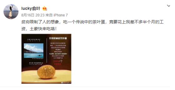 對(duì)于該茶葉的走紅,網(wǎng)友議論紛紛。有人認(rèn)為這是嘩眾取寵,和某針管書(shū)法家有異曲同工之妙,有人詢問(wèn)”吃了會(huì)上天?“,還有人一口認(rèn)定”這不是洗錢嗎“,也有網(wǎng)友就所謂”精選果碳、潮州紅泥炭爐“提出質(zhì)疑:”再牛逼的木材燒出來(lái)的火溫難道還有差別?“,更多網(wǎng)友自嘲,貧窮限制了人的想象,吃一個(gè)傳說(shuō)中茶葉蛋,竟要花上我差不多半個(gè)月的工資。