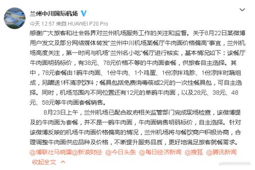 8月23日上午,蘭州機(jī)場已配合政府相關(guān)監(jiān)管部門完成現(xiàn)場檢查,該微博提及的牛肉面為套餐,并不是一碗牛肉面,牛肉面銷售明碼標(biāo)價(jià),自主選擇。針對該微博反映的機(jī)場牛肉面價(jià)格偏高的情況,蘭州機(jī)場將與餐飲商戶積極協(xié)商,合理調(diào)整牛肉面供應(yīng)品種及價(jià)格,不斷提升服務(wù)品質(zhì),更好地滿足旅客就餐需求。