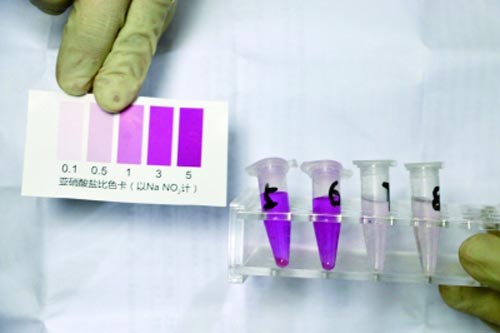 11個樣品檢測液顏色均有變化,均檢出亞硝酸鹽成分。其中5號、6號呈現(xiàn)紫紅色,亞硝酸鹽含量最高,45mg/kg,高于預(yù)包裝熟食不得超過30mg/kg的國家限量標(biāo)準(zhǔn)。