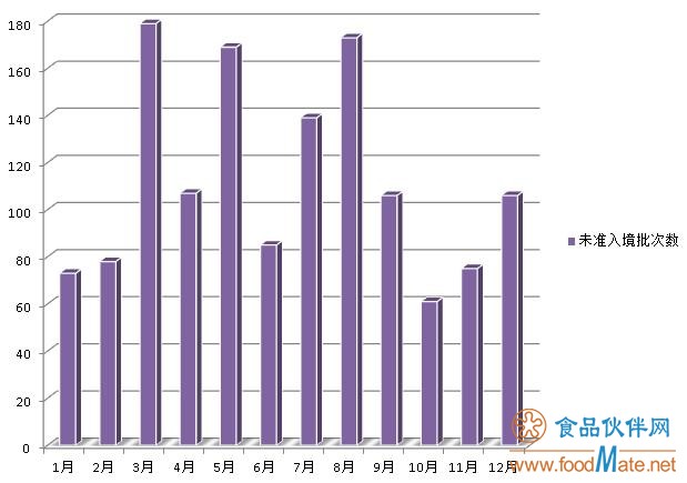 2018年共有1351批次超三千多噸食品檢出不符合我國法律法規(guī)和標(biāo)準(zhǔn)而未準(zhǔn)入境。每月未準(zhǔn)入境的食品批次數(shù)量如圖所示,其中,3月、5月、8月檢出的不合格批次數(shù)量居多。