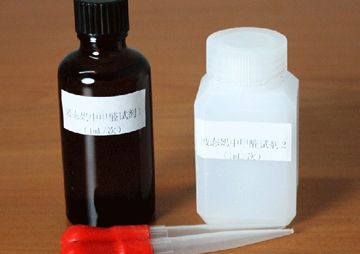 吸取樣品 2mL 于試管中,加入 1ml 試劑 1,搖勻后再加入 1ml試劑 2,振蕩混勻,置于沸水燒杯中維持 1 分鐘,觀察試管中顏色的變化,若出現(xiàn)不同深度的咖啡色,表明樣品中摻有甲醛,若出現(xiàn)淡黃色表明樣品中未摻加甲醛。