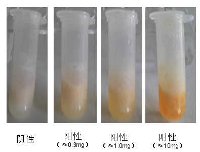 化妝品中的喹諾酮類物質(zhì)與檢測(cè)試劑反應(yīng)生成橙黃(紅)色化合物,含量越高,橙黃色越深。