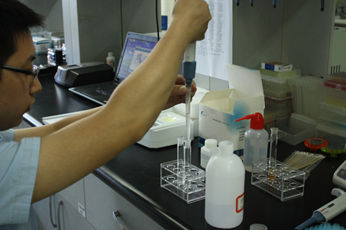 4、 取兩根試管,分別作為樣品管和對(duì)照管。在樣品管加入3ml樣品液,在對(duì)照管中加入3ml緩沖液,隨后分別加入20ul顯色劑和50ul酶試劑。蓋塞混勻靜置10min。