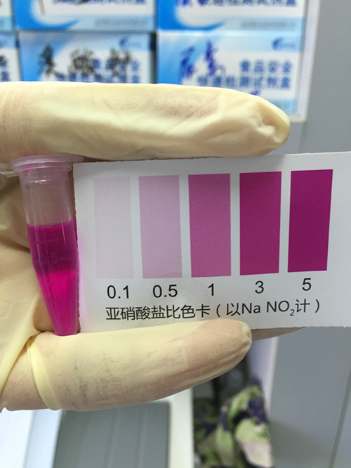 通過(guò)顏色比對(duì),我們可以清楚看到顏色由無(wú)色變?yōu)樽仙瑓⒄諏?duì)比卡,可知此樣本中的亞硝酸鹽含量為30~50mg/kg,屬于陽(yáng)性樣本。