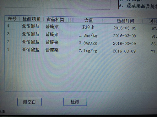 將裝有空白溶液及樣品液的比色皿放入儀器內檢測,檢測結果如圖所示。從上到下分別為1號、3號、12號、14號樣品中亞硝酸鹽含量的檢測,結果顯示均符合國家標準。