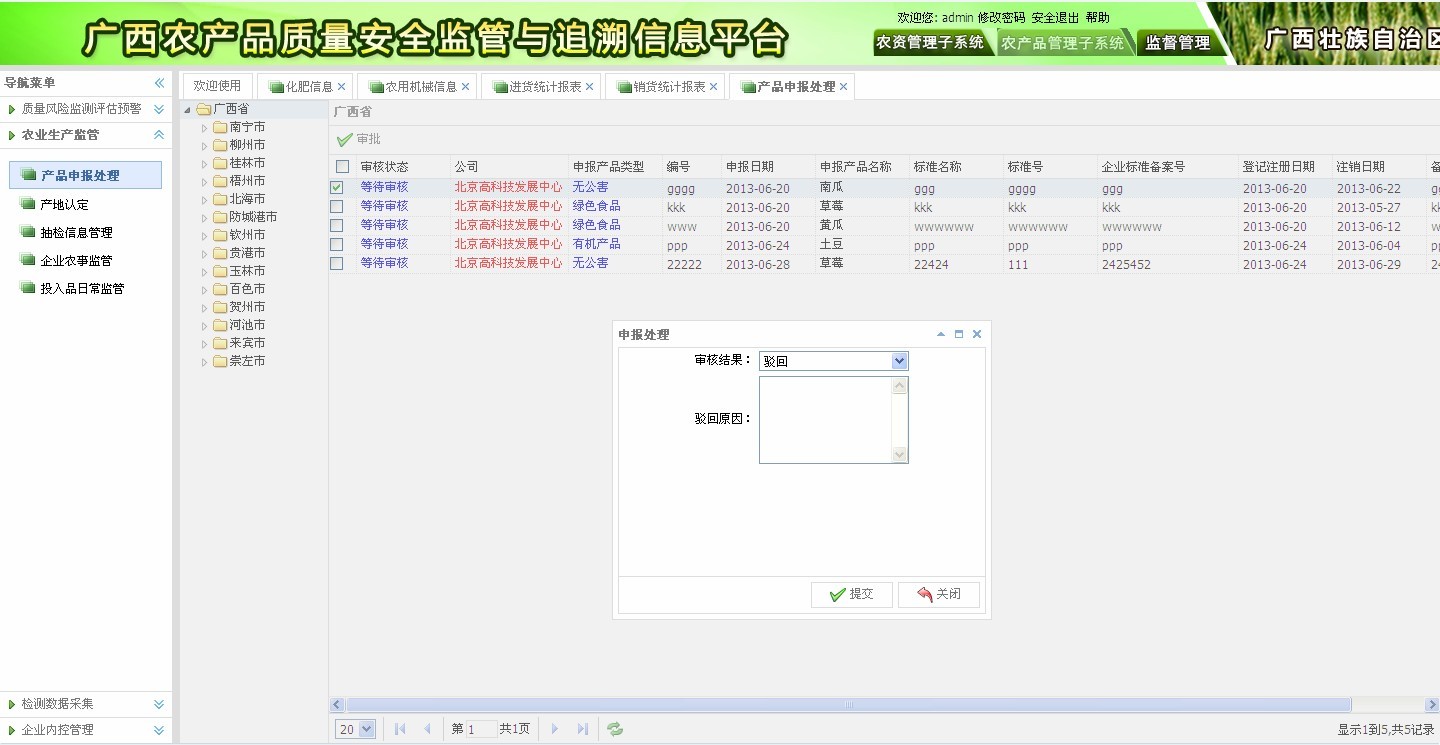 通過本板塊可對全自治區農業投入品實現動態管理,為農業投入品監測、監控、監管提供信息支撐,向社會發布農資產品質量安全信息,推介優質產品,公布誠信和“守合同、重信用”企業名單,披露不合格產品及其生產(加工)企業名單,引導消費。如圖2-5所示