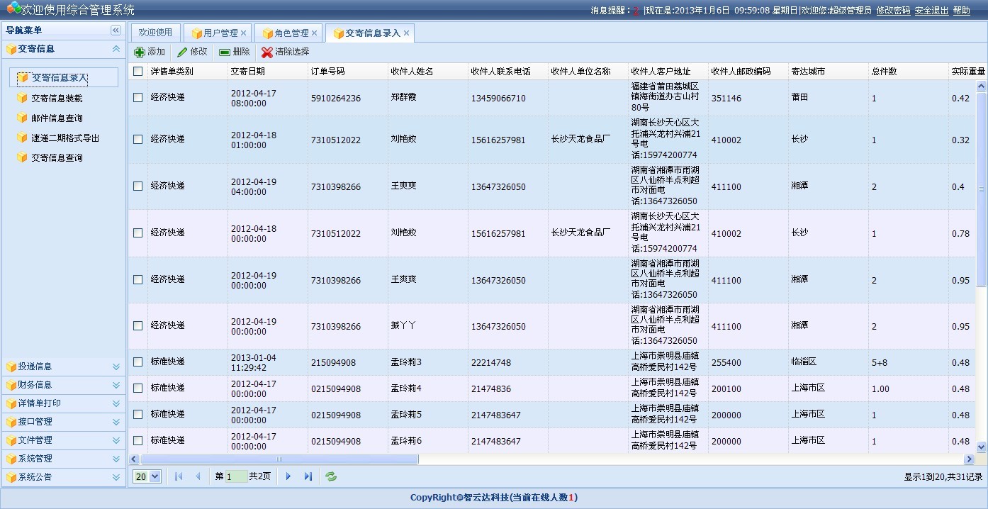 主要用于錄入郵件的交寄信息,并提供增刪改的功能。便于隨時跟蹤郵件,如下圖所示: